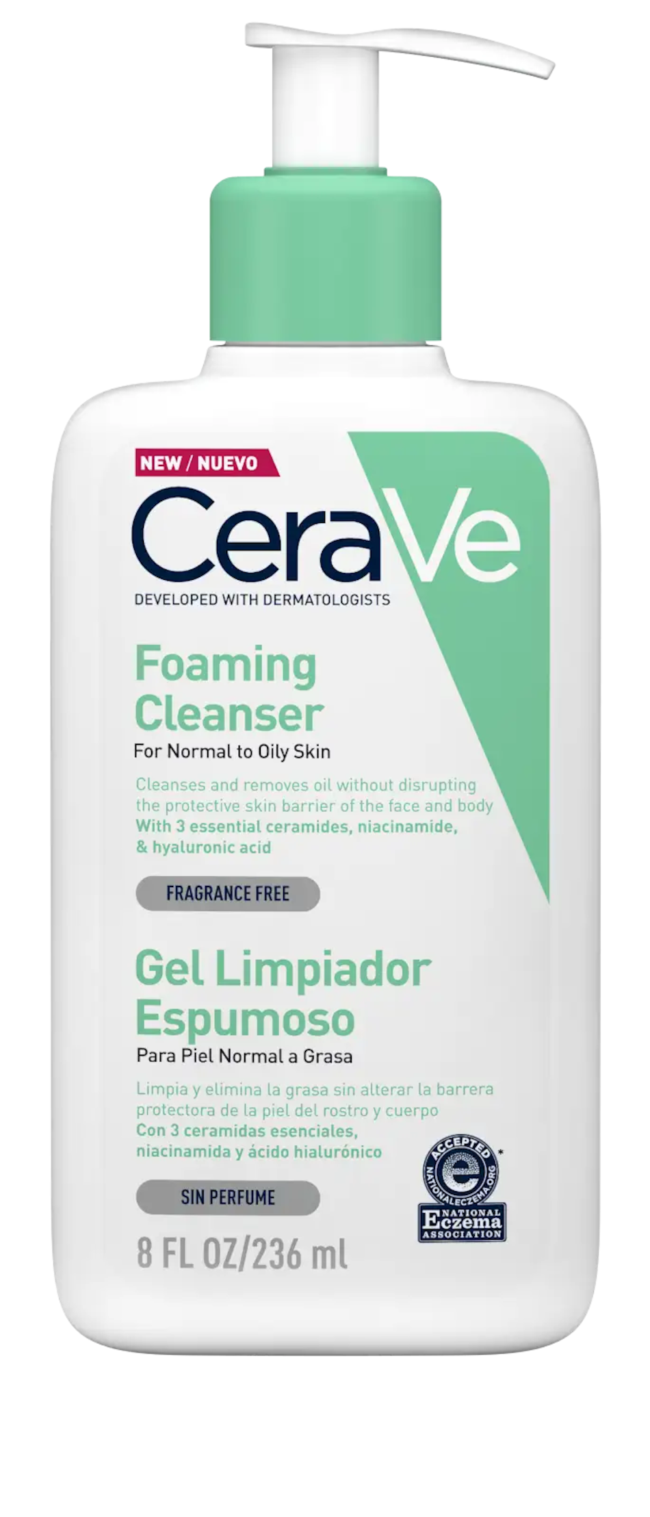 El Gel Limpiador Espumoso es ideal para eliminar el exceso de grasa, suciedad y maquillaje. Tiene una textura suave y no altera la barrera protectora de la piel. Su fórmula, a base de gel, contiene ceramidas, ácido hialurónico y niacinamida para ayudar a restaurar la barrera de la piel, atraer la hidratación y calmar la piel.