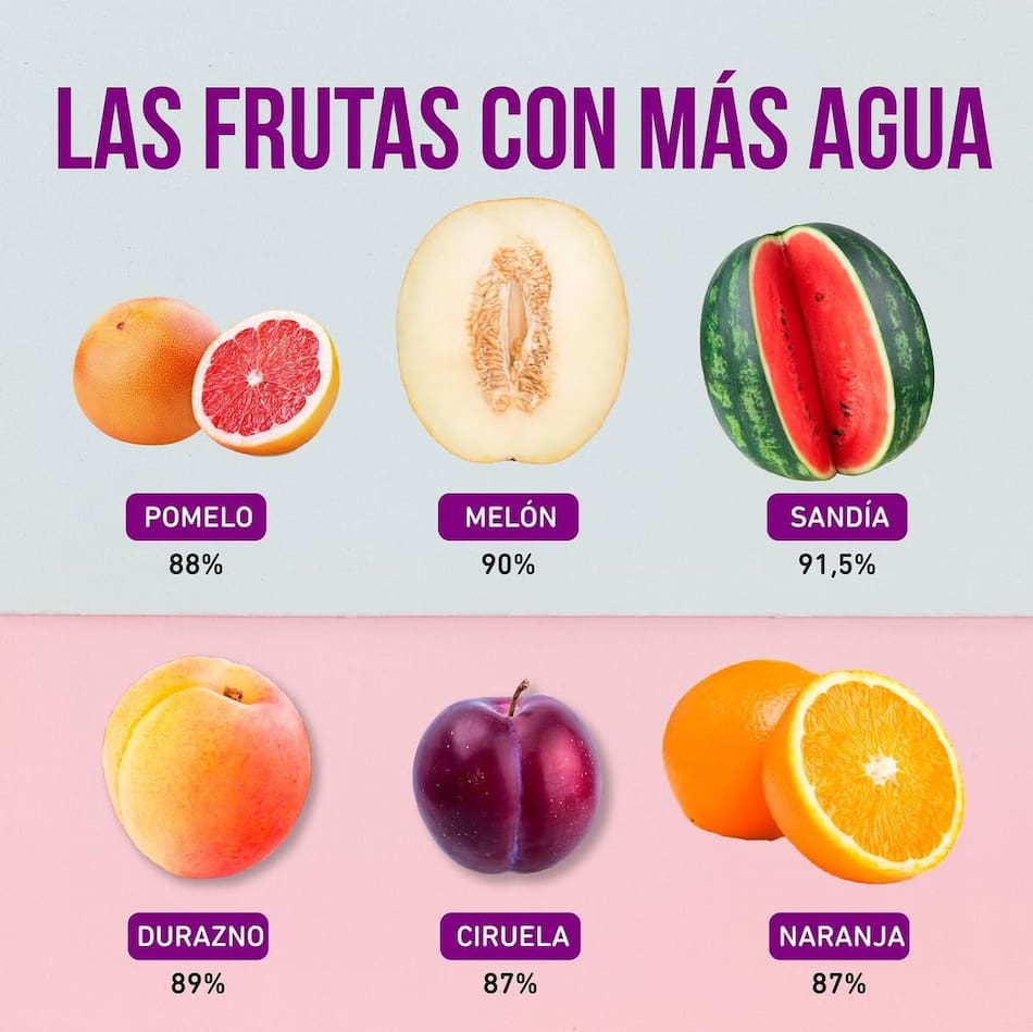 Según explica el sitio @integra.ok, creado por la nutricionista Laura Romano, si bien el agua presente en las frutas suma a la hidratación diaria, lo ideal es que la mayor parte de los líquidos provenga de agua pura. Además, señala que se recomienda consumir entre 2 y 3 frutas diarias.