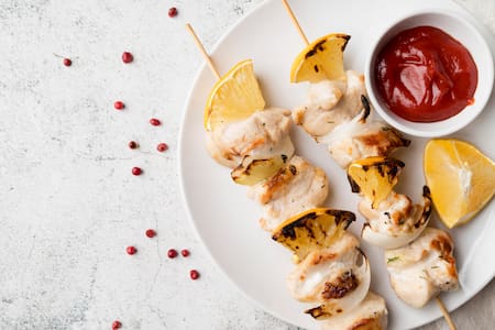 - Cena: Pinchos de carne o pollo, morrón de distintos colores y cebolla acompañada de ensalada de tomate, lechuga y garbanzos