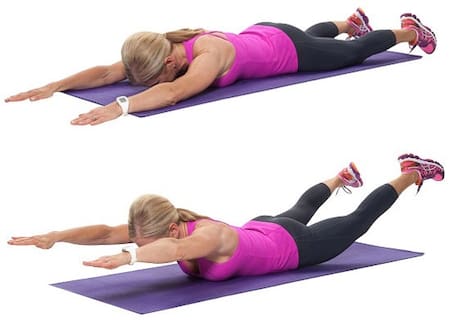 Luego se incorpora la extensión de cadera, en tres series de 12 repeticiones, que refuerza los extensores lumbares. Se realiza boca abajo, elevando brazos y piernas de forma controlada, manteniendo el cuello en posición neutra.