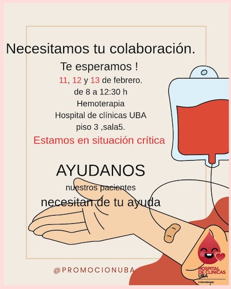 Las personas interesadas en donar pueden acercarse al Banco de Sangre del Hospital de Clínicas (Av. Córdoba 2351), ubicado en el 3er piso - Sala 5. El horario de atención es de lunes a sábados de 8:00hs a 12:30hs. Es necesario llevar DNI. Para más información visitar las redes sociales del servicio de Hemoterapia o acercarse personalmente en el horario indicado.