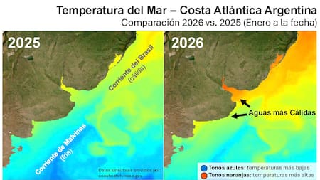 Acercarse al mar en la Costa Atlántica este verano tiene una sorpresa agradable: el agua está más cálida de lo habitual. Y no es solo una sensación subjetiva. Los satélites lo confirman con datos duros: la temperatura superficial del mar muestra valores hasta 3 °C por encima del promedio histórico en buena parte de la costa bonaerense y también en el Río de la Plata. En las imágenes de satélite, estas anomalías aparecen marcadas en tonos anaranjados, señal clara de aguas más templadas.