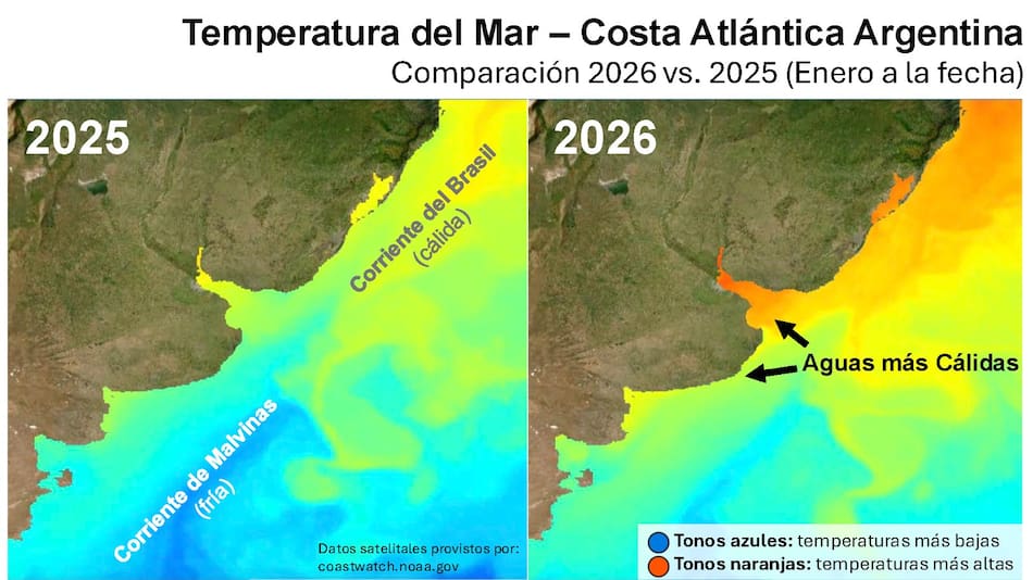 Este verano es distinto. Los satélites muestran que, de manera inusual, la Corriente de Brasil se ha desplazado más al sur de lo habitual. Eso permitió que aguas más cálidas se acerquen a nuestra costa y “bañen” gran parte del litoral bonaerense. El resultado: temperaturas del mar claramente superiores a las normales.
