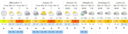 De este modo, la semana será predominantemente calurosa, especialmente entre miércoles y viernes, con máximas que superan los 30 °C y baja probabilidad de lluvia. Hacia el sábado y domingo aumenta la inestabilidad, con posibilidad de tormentas y descenso térmico.