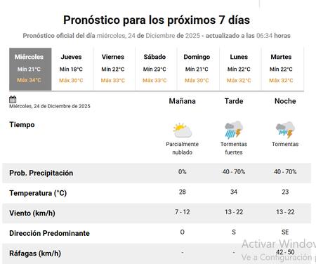 Este miércoles 24 de diciembre, la Nochebuena se presenta con altas temperaturas y condiciones inestables. Según el Servicio Meteorológico Nacional, la jornada comenzará con cielo parcialmente nublado y temperaturas elevadas desde temprano.