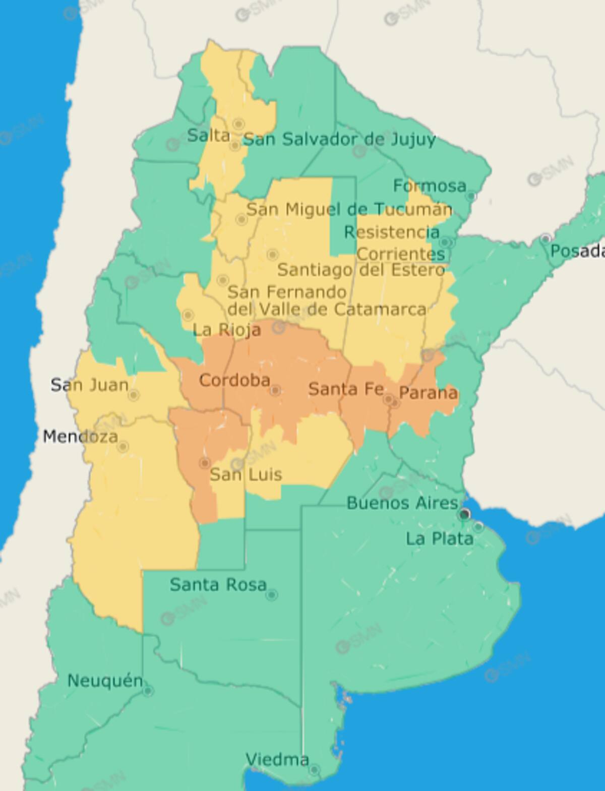 El Servicio Meteorológico Nacional (SMN) lanzó alertas meteorológicas de nivel amarillo y naranja por lluvias y tormentas para 14 provincias argentinas durante este jueves 8 de enero de 2026.