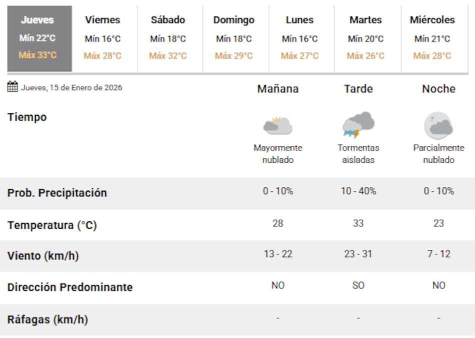 Este viernes 16 de enero se dará un descenso en el termómetro: la mínima pasará a ser de 18°, mientras que la máxima no superará los 30°. La nubosidad esperada marca un cielo entre ligeramente y parcialmente nublado.