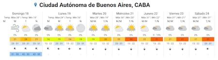 El lunes 19 llegará con un leve descenso térmico: la máxima será de 24°C y la mínima de 16°C, con cielo mayormente despejado durante toda la jornada.