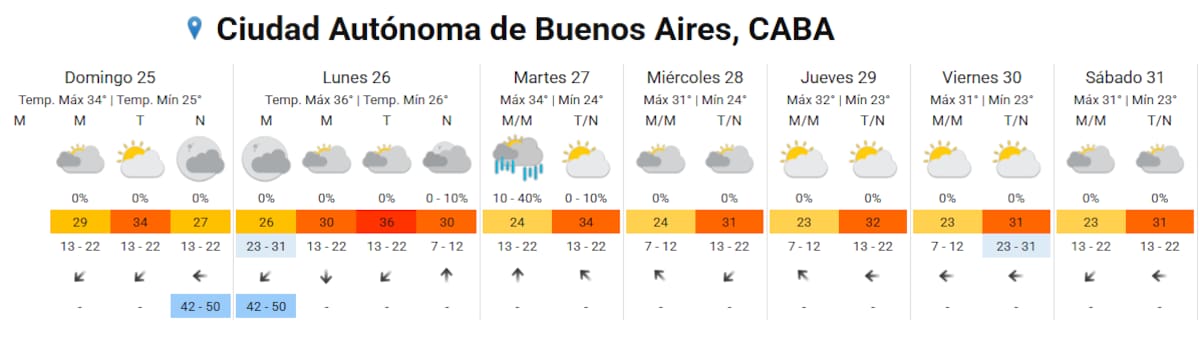 El lunes 26 será el día más caluroso de la semana, con una máxima que podría alcanzar los 36 °C, cielo parcialmente nublado y sin lluvias previstas. Las altas temperaturas continuarán durante el resto de los días, aunque con valores levemente más moderados.