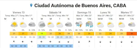 - Sábado 14: descenso marcado de temperatura, mínimas cercanas a los 19° y una tarde mayormente soleada con máximas en torno a los 26°.