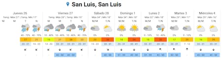 Según el pronóstico, este jueves se esperan tormentas durante gran parte del día en San Luis, con altas probabilidades de precipitaciones. La temperatura máxima rondará los 27°C, mientras que la mínima será de 17°C.