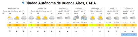 - Sábado 21: será el día de mayor cambio, con tormentas fuertes durante la mañana y el mediodía, probabilidad de lluvia elevada y descenso térmico. La temperatura irá de 21° a 25°.