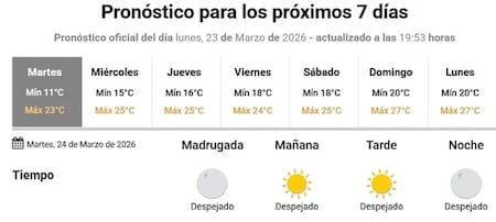 Para este martes 24 de marzo, se espera una jornada completamente despejada, sin probabilidad de lluvias y con temperaturas que irán desde los 11 grados de mínima hasta los 23 de máxima. El viento será leve, lo que reforzará la sensación de un día otoñal pero agradable.