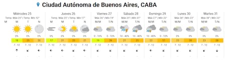- Miércoles 25: se presenta con cielo despejado durante gran parte del día, sin probabilidades de lluvia. La temperatura mínima será de 12 grados y la máxima alcanzará los 25, con ambiente templado y viento leve.