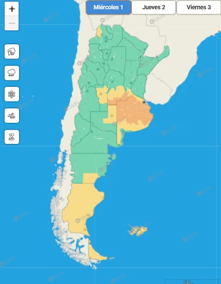 La advertencia de mayor intensidad abarca sectores de Provincia de Buenos Aires, sur de Entre Ríos y zonas cercanas del litoral, donde se esperan tormentas fuertes o localmente severas, acompañadas por abundante caída de agua en cortos períodos, ráfagas intensas, actividad eléctrica y ocasional caída de granizo.