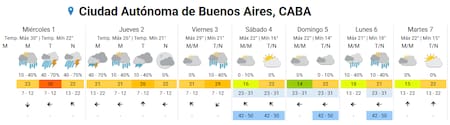 - Sábado 4 de abril: mínima de 16 °C y máxima de 22 °C. Habrá 10% de probabilidades de lluvia a la mañana y los vientos alcanzarán los 50 km/h.