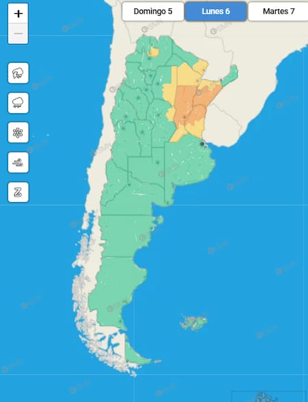 Según el mapa de alertas del Servicio Meteorológico Nacional, para este lunes 6 gran parte del país se mantiene bajo diferentes niveles de advertencia meteorológica por tormentas y fenómenos asociados.