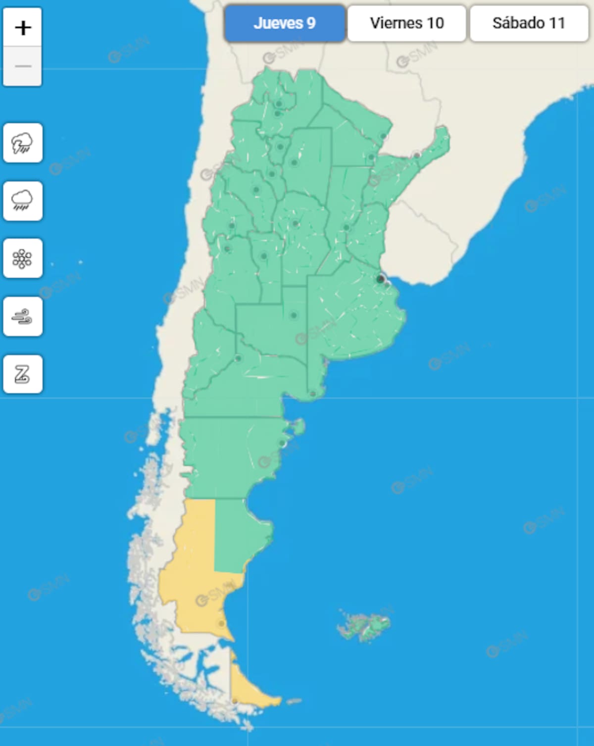 Para este jueves 9 de abril, el mapa de alertas del Servicio Meteorológico Nacional (SMN) muestra una situación poco habitual: gran parte del territorio argentino se mantiene sin advertencias meteorológicas, mientras que solo algunas zonas del sur del país continúan bajo alerta amarilla por fenómenos que podrían generar complicaciones.