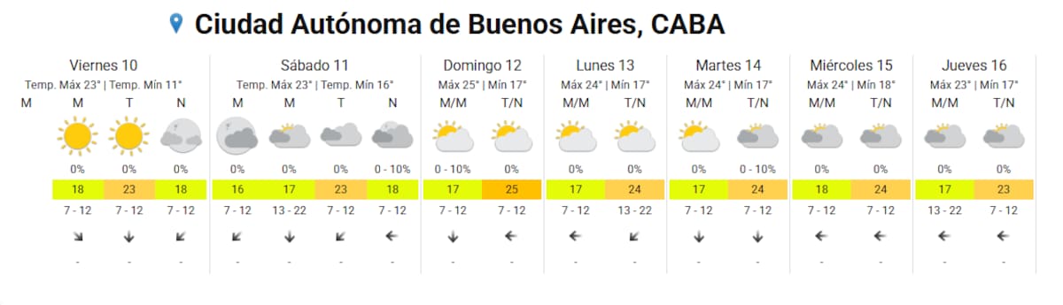 El clima en la Ciudad Autónoma de Buenos Aires será estable y mayormente agradable. Para este viernes 10 de abril se espera una jornada con sol, una temperatura máxima cercana a los 23°C y una mínima de 11°C, sin probabilidades de lluvia.