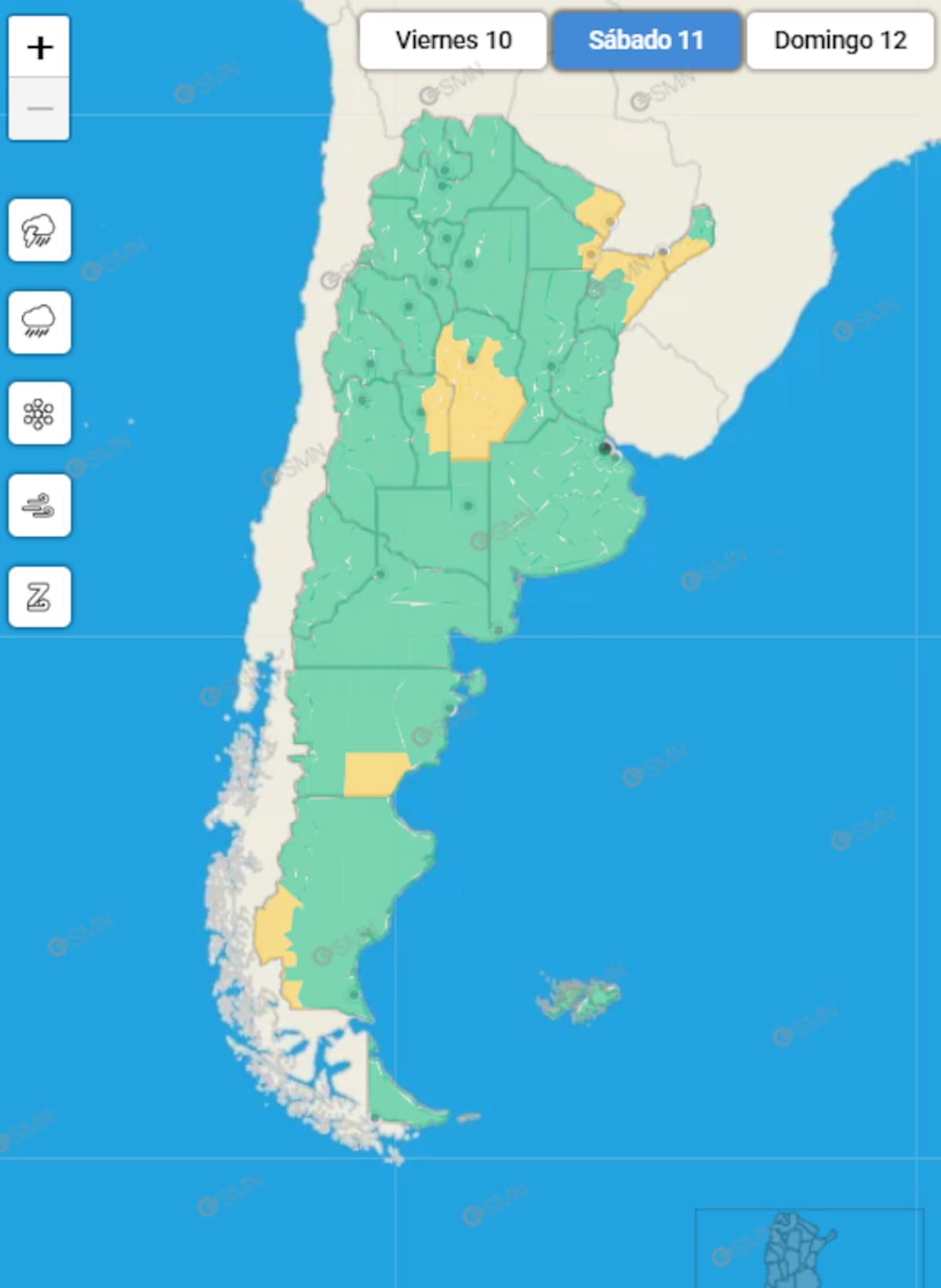 El pronóstico del tiempo para este sábado 11 muestra un escenario mayormente estable en gran parte de la Argentina, aunque con alertas meteorológicas de nivel amarillo en varias regiones del territorio, según el mapa del Servicio Meteorológico Nacional (SMN).