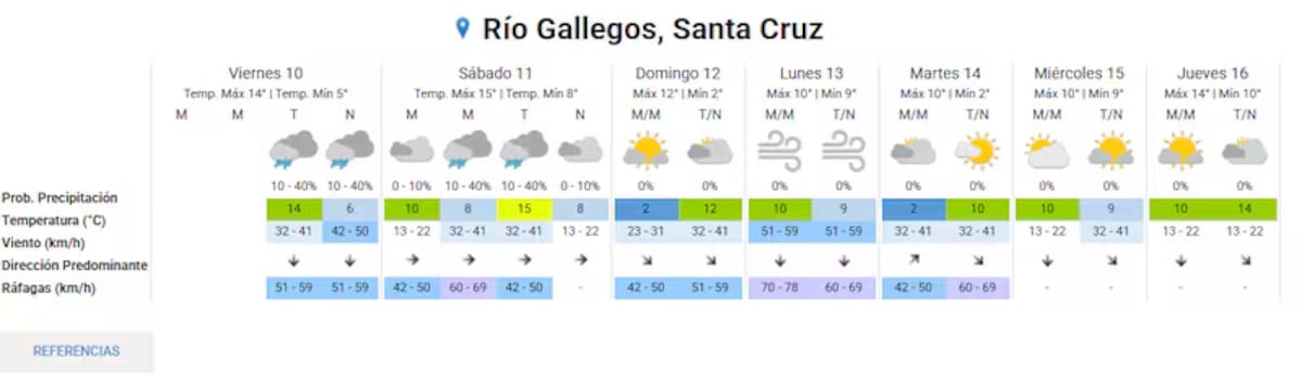 - Río Gallegos: lluvias persistentes, cielo cubierto y condiciones inestables durante varios días consecutivos.