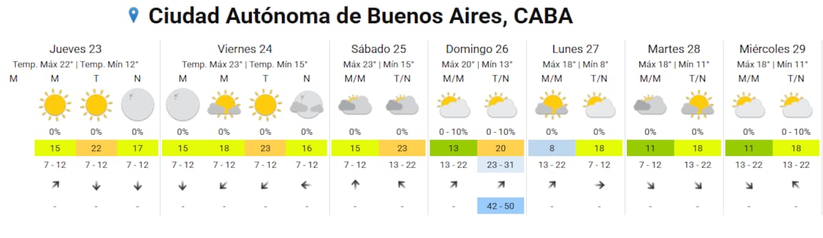 El sábado 25 mantendrá la misma máxima de 23°C, con nubosidad variable y una mínima también en torno a los 15°C, consolidándose como uno de los días más cálidos del período.