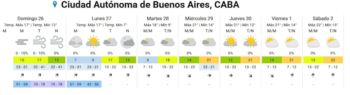 El pronóstico extendido del Servicio Meteorológico Nacional (SMN) informó que la próxima semana tendrá variaciones de temperatura en la Ciudad de Buenos Aires. Sin embargo, el día más frío será este lunes 27, cuando se registrará la temperatura mínima más baja del período, con apenas 7 grados.