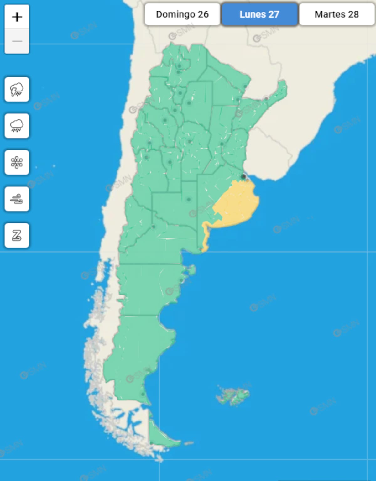 El mapa de alertas del Servicio Meteorológico Nacional (SMN) indica que para este lunes 27 rige una alerta amarilla en el este de la provincia de Buenos Aires, especialmente en el sudeste bonaerense y zonas cercanas a la costa atlántica.