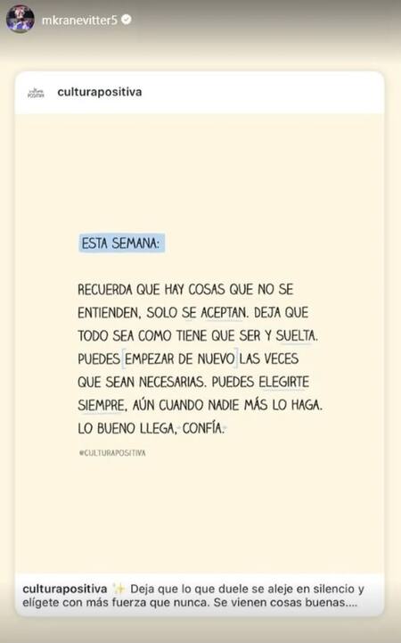 “Esta semana: recuerda que hay cosas que no se entienden, solo se aceptan. Deja que todo sea como tiene que ser y suelta. Puedes empezar de nuevo las veces que sean necesarias. Puedes elegirte siempre, aún cuando nadie más lo haga. Lo bueno llega, confía”, reza la publicación de la cuenta Cultura Positiva que Kraneviter replicó en una historia.