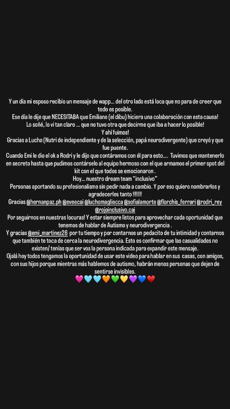 “Cuando Emi le dio el ok a Rodri y le dijo que contáramos con él para esto, tuvimos que mantenerlo en secreto hasta que pudimos contárselo al equipo hermoso con el que armamos el primer spot del kit con el que todos se emocionaron”, agregó. Luego, la mujer le agradeció a su “dream team inclusivo” y al arquero: “Gracias por tu tiempo y por contarnos un pedacito de tu intimidad y que también le toca de cerca la neurodivergencia. Esto es confirmar que las casualidades no existen. Tenías que ser vos la persona indicada para expandir este mensaje”.