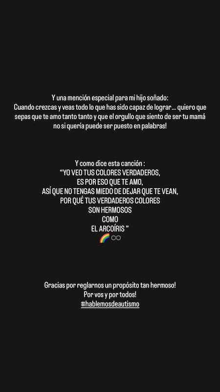 Luego, en otra historia, Laura habló sobre su deseo de que la campaña se haga viral y se comente porque “mientras más hablamos de autismo, habrá menos personas que dejen de sentirse invisibles”. Por último, habló sobre su hijo Benicio y le agradeció: “Cuando crezcas y veas todo lo que fuiste capaz de lograr, quiero que sepas que te amo tanto y que el orgullo que siento de ser tu mamá ni siquiera puede ser puesto en palabras”.