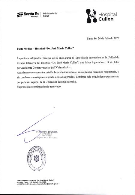 “La paciente Alejandra Oliveras, de 47 años, cursa el 10mo día de internación (…) actualmente se encuentra estable hemodinámicamente, en asistencia mecánica respiratoria, y sin cambios neurológicos respecto a los días previos”, señala el parte oficial firmado por el director del hospital, Bruno Moroni.