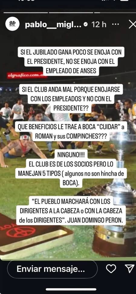 Mediante una historia en su cuenta de Instagram, el exarquero brindó un fuerte descargo: “Si el jubilado gana poco, se enoja con el presidente, no se enoja con el empleado de ANSES. Si el club anda mal, ¿por qué enojarse con los empleados y no con el presidente? ¿Qué beneficios le trae a Boca ‘cuidar’ a Román y sus compinches? ¡Ninguno! El club es de los socios, pero lo manejan 5 tipos (algunos no son hinchas de Boca)”, disparó.
