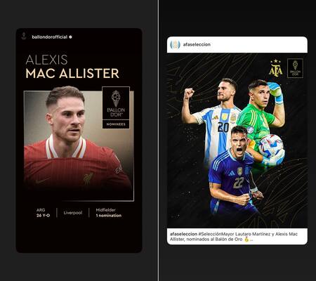 A modo de reacción ante la nominación, hombre del Liverpool y la Selección Argentina publicó en su cuenta de Instagram dos historias: una de sobre el anuncio oficial de la cuenta del Balón de Oro y otra de la Asociación del Fútbol Argentino (AFA), que incluyó también a Emiliano “Dibu” Martínez y Lautaro Martínez, los otros argentinos que competirán en la prestigiosa gala.