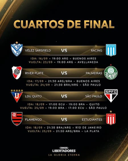 El primer duelo será el cruce argentino entre Vélez y Racing, que abrirán la serie el martes 16 en el estadio José Amalfitani desde las 19. La vuelta se jugará una semana después, el 23, en el estadio Presidente Perón y en el mismo horario.