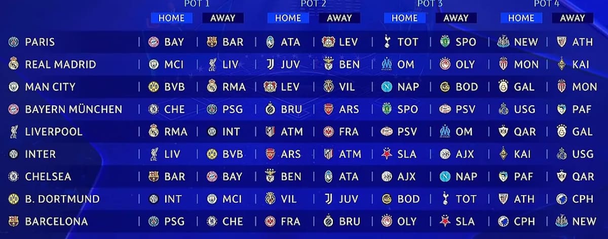De esta manera, la UEFA definió el fixture completo de los 144 partidos. Cabe señalar que la fase de liga se disputará entre el 16 de septiembre y 28 de enero, con todos los partidos de la última fecha en simultáneo.