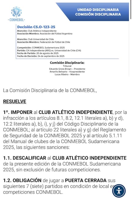 Además, el club de Avellaneda fue sancionado con la disputa de siete partidos a puertas cerradas en futuros torneos internacionales