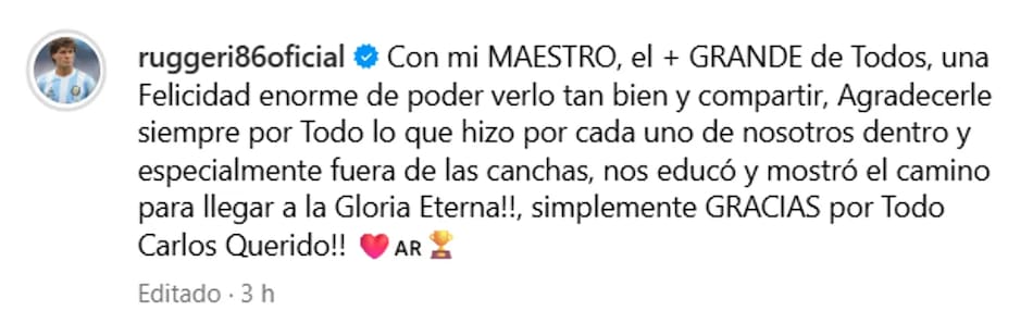 “Con mi MAESTRO, el + grande de Todos, una Felicidad enorme de poder verlo tan bien y compartir. Agradecerle siempre por Todo lo que hizo por cada uno de nosotros dentro y especialmente fuera de las canchas, ¡¡nos educó y mostró el camino para llegar a la Gloria Eterna!!, simplemente GRACIAS por Todo Carlos Querido!!”.