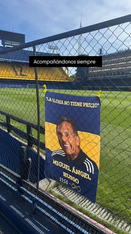 En su cuenta de Instagram, Úbeda compartió la imagen de una bandera con la cara de Russo y la frase “La gloria no tiene precio” atada en uno de los alambrados de La Bombonera y escribió: “Acompañándonos siempre”.