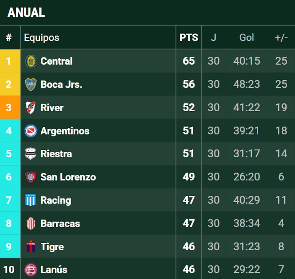 Rosario Central es el líder y el único que ya aseguró su participación en la siguiente edición de la competición más importante del continente, a través de esta vía. Detrás quedó Boca, que ganó ante Estudiantes, y River que quedó tercero.