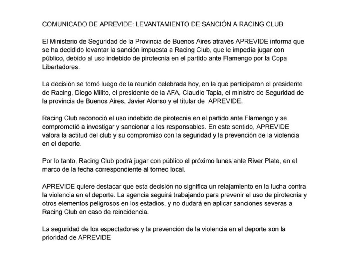 La Agencia de Prevención de Violencia en el Deporte (Aprevide) levantó la sanción contra Racing y el partido ante River Plate por los playoffs del Torneo Clausura se jugará con hinchas en el Cilindro de Avellaneda.