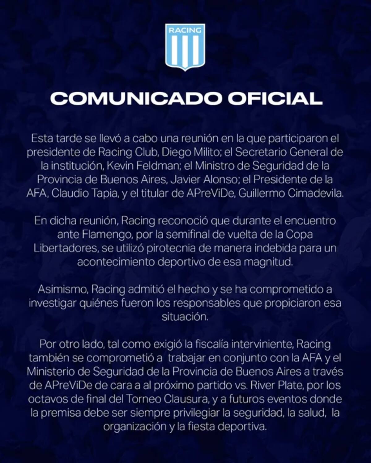 Racing informó que en una reunión con la Asociación del Fútbol Argentino (AFA) y autoridades de seguridad “reconoció el uso indebido de pirotecnia” durante el partido ante Flamengo por la Copa Libertadores.
