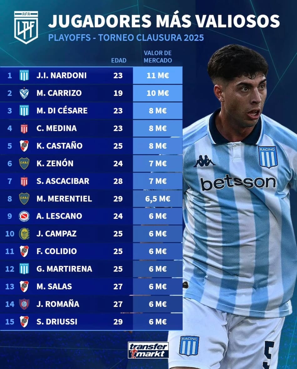En el primer puesto se encuentra Juan Ignacio Nardoni (Racing Club), tasado en 11 millones de euros. En segundo lugar Maher Carrizo (Vélez Sarsfield), valuado en 10 millones, y el podio lo completa Marco Di Césare (Racing Club), cotizado en 8 millones.