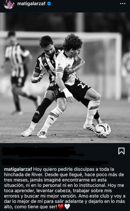 “Hoy quiero pedirle disculpas a toda la hinchada de River. Desde que llegué, hace poco más de tres meses, jamás imaginé encontrarme en esta situación, ni en lo personal ni en lo institucional”, expresó el jugador vía Instagram. La publicación está acompañada de una foto en blanco y negro del futbolista.