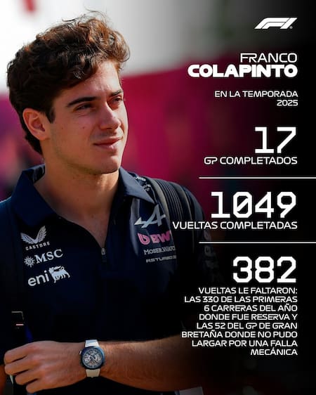 La diferencia entre Colapinto y Russell se encuentra en las primeras seis carreras del año, donde Franco fue piloto de reserva de Alpine (el titular fue Jack Doohan). Las 52 restantes pertenecen al GP de Gran Bretaña, donde no pudo largar por una falla mecánica.