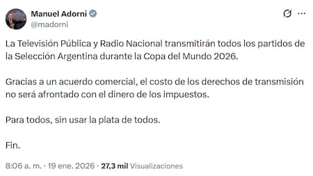 “La Televisión Pública y Radio Nacional transmitirán todos los partidos de la Selección argentina durante la Copa del Mundo 2026”, expresó en un mensaje que difundió en la red social X.