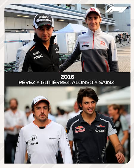 La última vez que la máxima categoría contó con la presencia de cuatro pilotos hispanos fue en 2016. Aquel año, los representantes fueron: Fernando Alonso (McLaren), Sergio “Checo” Pérez (Force India), Carlos Sainz Jr. (Toro Rosso) y el mexicano Esteban Gutiérrez (Haas).