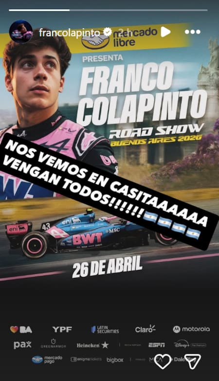 “Conducir en casa un auto de Fórmula 1 será uno de los momentos más especiales de mi vida. Es mi forma de devolver, aunque sea un poco, todo el apoyo y el cariño que recibí desde muy chico, que me impulsa todos los días a seguir soñando con alcanzar todos mis objetivos en mi carrera. Cada mensaje, cada bandera y cada aliento siempre estuvieron presentes. Esto es para todos ustedes, para disfrutar juntos este momento especial”, confesó Colapinto, quien está atravesando su tercera temporada en la F1.