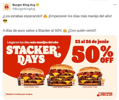 Burger King relanzó en Argentina una nueva edición de los “Stacker Days”, una promoción que ofrece un 50 % de descuento en toda la línea de hamburguesas Stacker —doble, triple y cuádruple— y en sus combos completos. La campaña estará vigente hasta el 26 de junio en todos los locales del país.