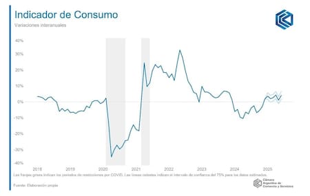 “En síntesis, el consumo masivo continúa en una senda de recuperación, mientras que el consumo de bienes durables muestra cierta moderación, aunque mantendría una tendencia positiva. No obstante, persiste un cambio en la composición del gasto de los hogares, con una mayor orientación hacia bienes durables, impulsada por el acceso al crédito, en cierto movimiento de sustitución del consumo cotidiano. Se estima que el ingreso disponible registrará una mejora a lo largo del año a medida que la actividad económica siga recuperando, en especial, en el último trimestre del año”, explicaron desde la CAC.